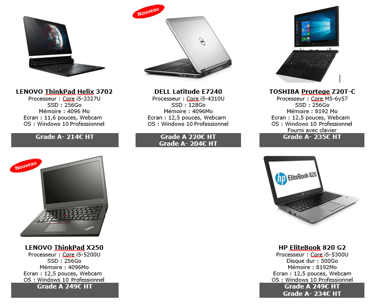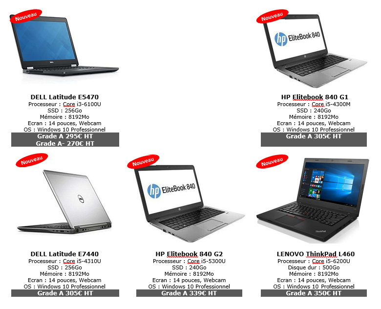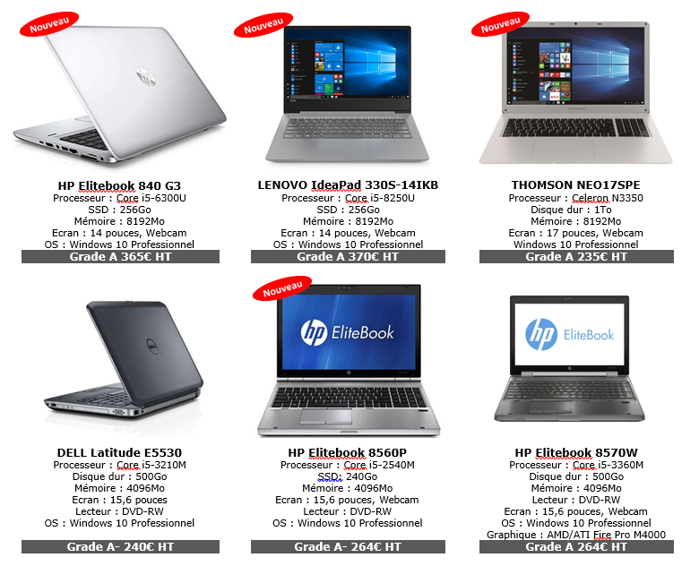 Matériel reconditionnéContactez nous pour obtenir un devis sur du matériel informatique reconditionné : – PC portables à partir de 190€ HT – PC Fixe à partie de 110€ HT – Garantie 1 an extensible 2 ans Vous trouverez ci-dessous des exemple de matériels reconditionnés. Veuillez nous contacter pour un devis personnalisé.